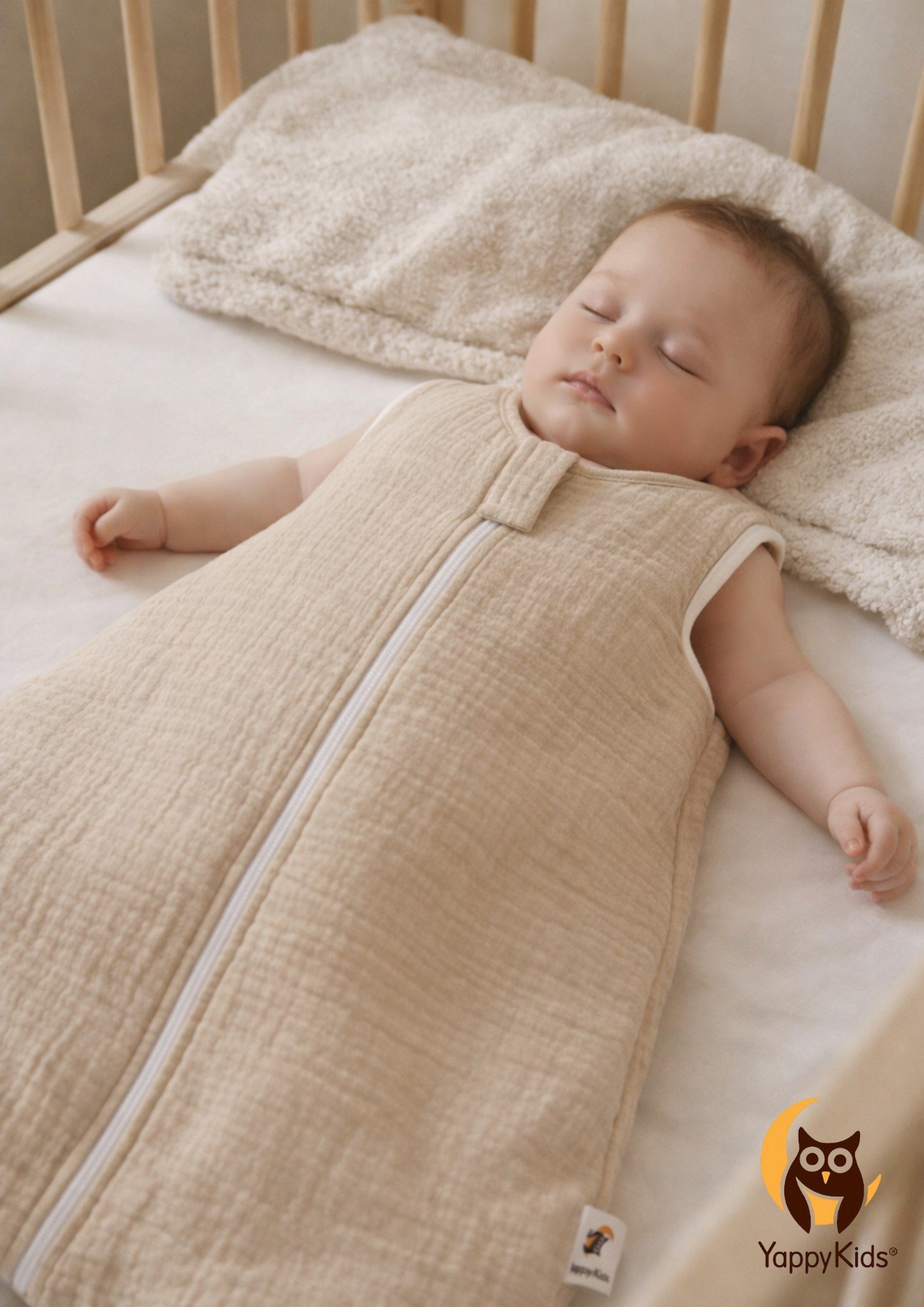 Both sleeping bags – YappySnug and YappyBuzz – are made from 100% cotton muslin, a soft, breathable, and baby-skin-friendly material. Muslin helps regulate temperature and reduces the risk of overheating, providing comfort both day and night.