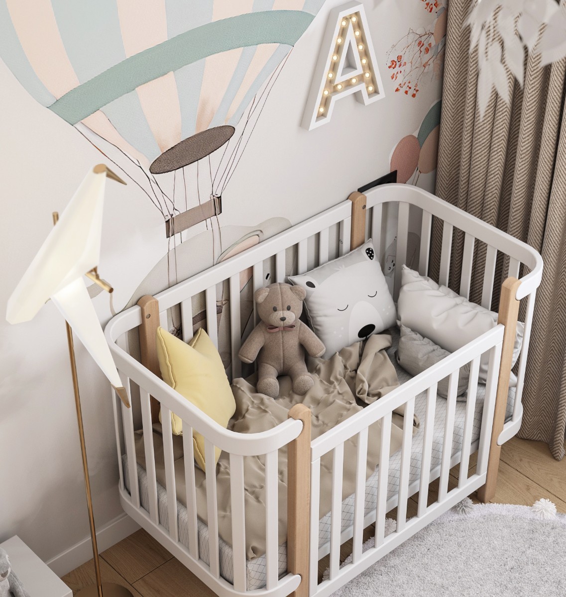 The crib has a height-adjustable bottom, and it can be put even diagonally, which effectively helps with colds in the baby. The side is adjustable too. It is possible to attach the crib to the parental crib.